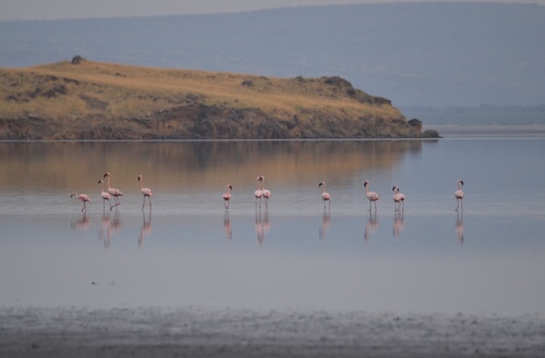 Ein Guide holt uns um halb sieben in der Frühe ab und wir fahren zusammen an den Lake Natron. Es ist leider bewölkt, so dass wir keinen fotogenen Sonnenaufgang sehen, aber unser Ziel heute Morgen sind auch eher Hunderte von weißen und pinkfarbenen Flamingos.