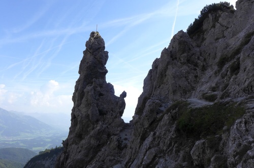Die vierte und letzte Etappe soll aber noch einmal eine wunderschöne Tour werden. Es geht frühmorgens von der Hütte weiter über den Panoramaweg bis zum Feldberg mit 1819m der höchste Punkt unserer Hüttentour. Unter dem Gipfelkreuz auf einer Bank sitzend staunen wir noch einmal über das gegenüberliegende Kaisergebirge, suchen die Klettersteige und -Wege, die sich durch die Gipfelsparten ziehen mit dem Auge und verfolgen dabei auch einen Rettungshubschrauber, der durch eine der Spalten fliegt und anscheinend nach Personen sucht.
