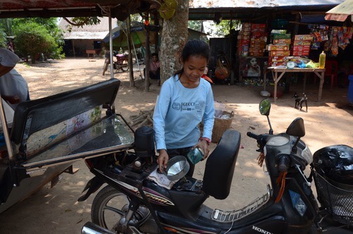 Wir sind komplett durchgeschwitzt aber voller schöner Eindrücke. Wieder zurück über den halben Kilometer Zugangsweg zum Tempel freuen wir uns auf eine erfrischende Tuk-Tuk Fahrt. Ich möchte nur noch duschen. Nach 2 Kilometern stockt plötzlich unser Gefährt, nix geht mehr. Unser Fahrer hat anscheinend schon etwas geahnt. Die Benzinanzeige ist defekt erklärt er uns und wir müssen mal eben auftanken. Gesagt, getan, hier sind zig Stände. Ein hübsches Mädchen macht unser Gefährt wieder fahrbereit und ab geht es nach Hause ins Hotel.